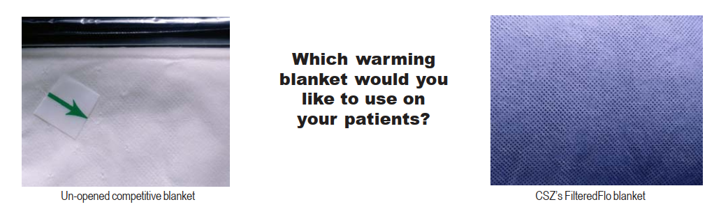 + CSZ is able to deliver WarmAir Therapy to your patients utilizing the patented non-woven delivery surface of the FilteredFlo blanket. Our FilteredFlo blankets require no perforation thereby avoiding unwanted and potentially dangerous particles in your operating room